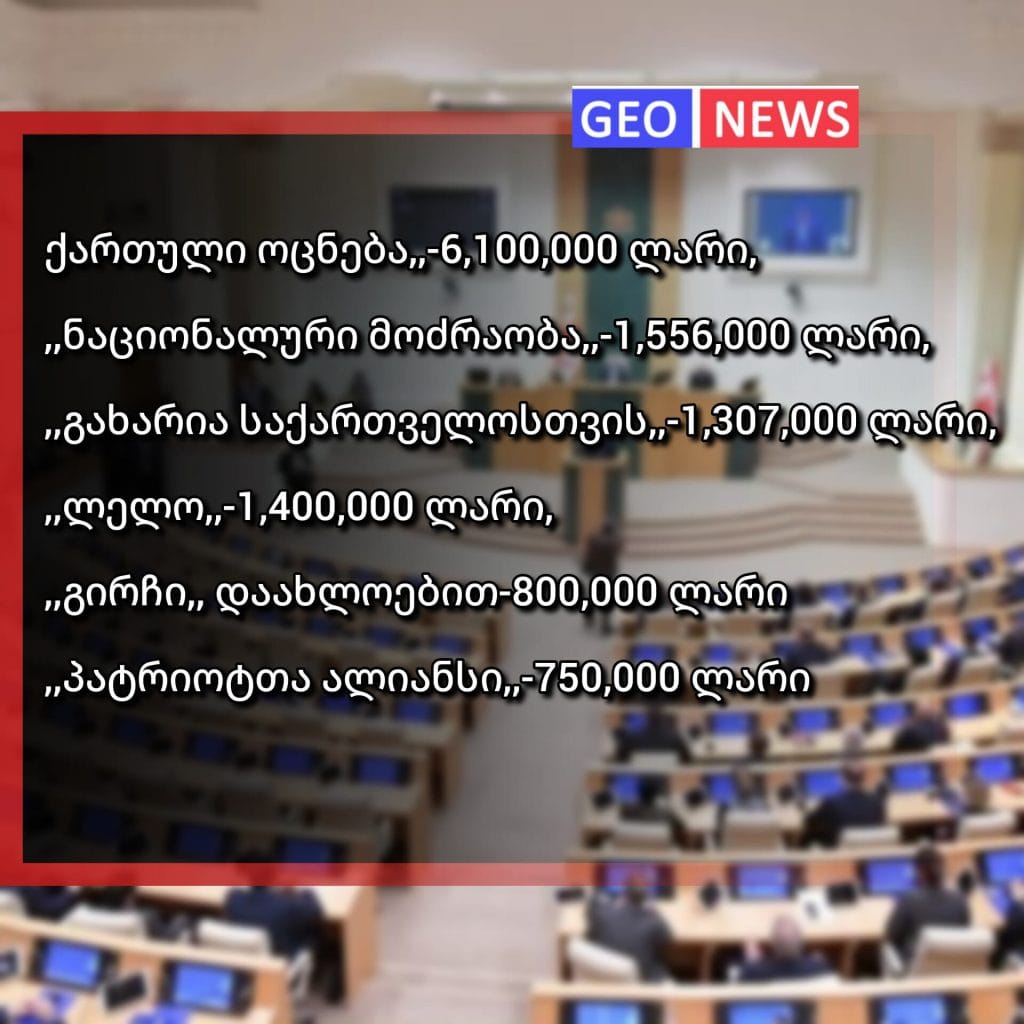 ,,გირჩი” დაახლოებით-800,000 ლარს მიიღებს, ხოლო ,,პატრიოტთა ალიანსი” -750,000 ლარს.
