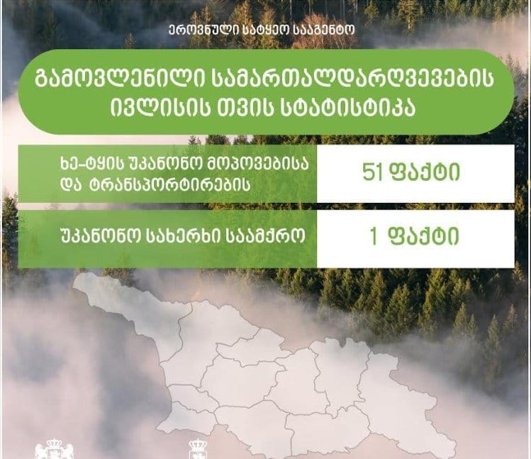 გარემოს დაცვისა და სოფლის მეურნეობის სამინისტროს სსიპ ეროვნული სატყეო სააგენტოს რეგიონული სატყეო სამსახურების თანამშრომლებმა მიმდინარე წლის ივლისის თვეში ქვეყნის მასშტაბით ხე-ტყის უკანონო მოპოვებისა და ტრანსპორტირების 51 ფაქტი გამოავლინეს.
