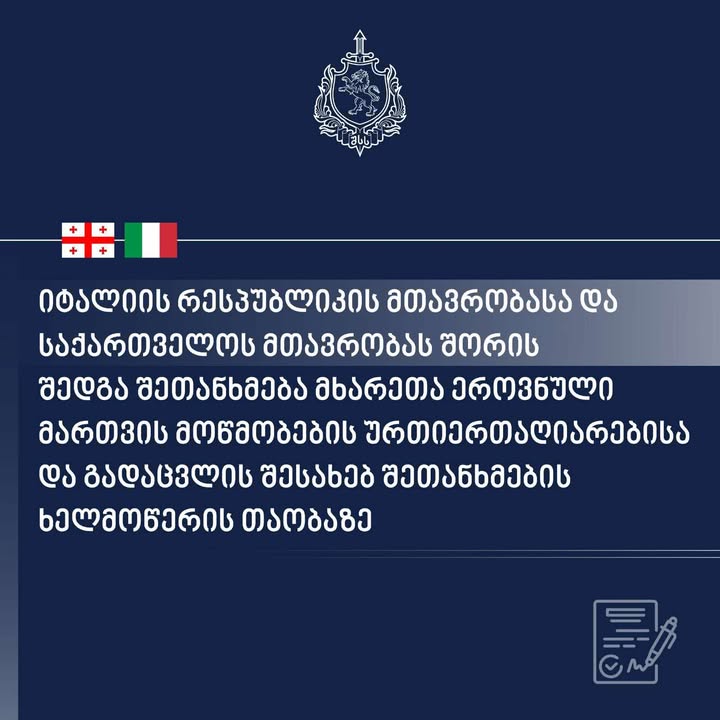 იტალიის რესპუბლიკის მთავრობასა და საქართველოს მთავრობას შორის შედგა შეთანხმება მხარეთა ეროვნული მართვის მოწმობების ურთიერთაღიარებისა და გადაცვლის შესახებ შეთანხმების ხელმოწერის თაობაზე