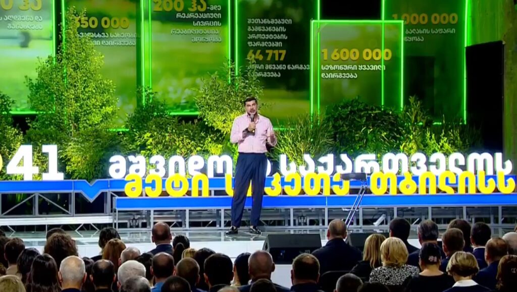„როგორც მმართველი პოლიტიკური ძალის მერობის კანდიდატი და თბილისის აწმყოსა და მომავალზე პასუხისმგებელი პირი, განვაგრძობ ჩვენი მოსახლეობისთვის  სამომავლო გეგმების გაცნობას. დღეს უნდა ვისაუბრო იმ პოლიტიკასა და მიმართულებაზე, რაზეც ყველაზე უკეთ თავად თბილისის რეალობა საუბრობს. როდესაც 2017 წელს მოვედით დაპირებით, რომ თბილისი იქნებოდა „სიცოცხლით სავსე ქალაქი“, ვგულისხმობდით სწორედ იმას, რაც დღეს სახეზეა –  სხვადასხვა ასაკის მქონე ადამიანებით სავსე პარკები, სკვერები, რეკრეაციული სივრცეები, ახალგაზრდები ყველა სპორტულ მოედანსა და სკეიტ პარკებში. უზარმაზარი მასშტაბის სამუშაო ჩატარდა გარემოს დაცვის პოლიტიკის მიმართულებით. არ დაგვიტოვებია თბილისის არცერთი უბანი და რაიონი, არცერთი სკვერი, ბაღი, პარკი, ხეივანი, გზაგამტარი თუ სატრანსპორტო კუნძულიც კი თბილისის გასამწვანებლად. ერთ დროს ნაგავსაყრელად და ჭაობად ქცეულ ტერიტორიებზე დღეს ულამაზესი პარკებია გაშენებული, რომლითაც თითოეული ჩემი ტანამშრომელი ამაყობს“, – განაცხადა კახა კალაძემ.