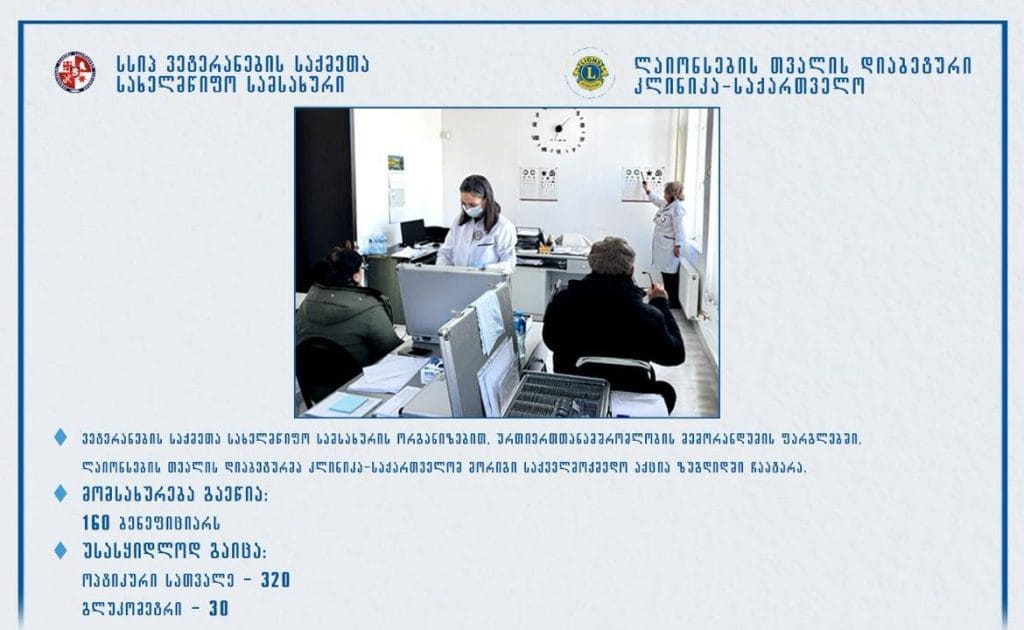 მიმდინარე წლის 1- 2 მარტს, ვეტერანების საქმეთა სახელმწიფო სამსახურის ორგანიზებით, ურთიერთთანამშრომლობის მემორანდუმის ფარგლებში, ლაიონსების თვალის დიაბეტურმა კლინიკა-საქართველომ, თბილისის სახელმწიფო სამედიცინო უნივერსიტეტის თვალის სნეულებათა დეპარტამენტთან ერთად, ზუგდიდის მუნიციპალიტეტში მცხოვრები ომისა და თავდაცვის ძალების ვეტერანებისა და მათი ოჯახის წევრთათვის, მორიგი, 29-ე უფასო ოფთალმოლოგიური გამოკვლევები ჩაატარა.