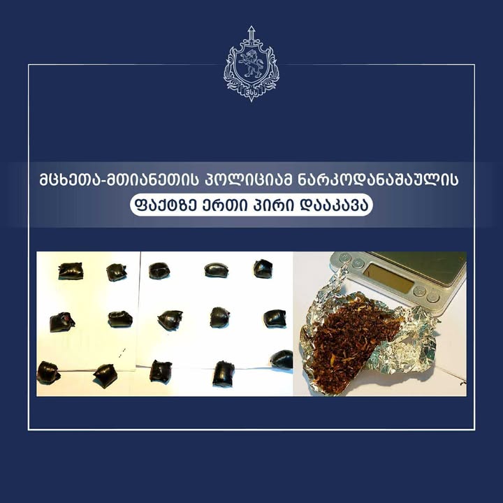 შინაგან საქმეთა სამინისტროს მცხეთა-მთიანეთის პოლიციის დეპარტამენტის თანამშრომლებმა, ჩატარებული ოპერატიული ღონისძიებებისა და საგამოძიებო მოქმედებების შედეგად, ოჯახური ძალადობის, მუქარისა და ნარკოტიკული საშუალების შეძენა-შენახვის ბრალდებით, ამჟამად პირობითი მსჯავრის ქვეშ მყოფი 2000 წელს დაბადებული თ.ფ. დააკავეს.