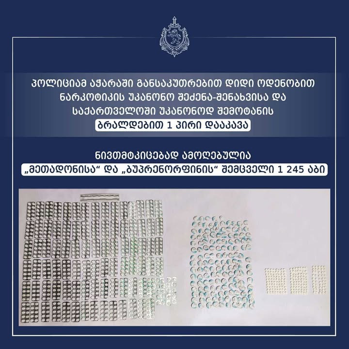 პოლიციამ აჭარაში განსაკუთრებით დიდი ოდენობით ნარკოტიკის უკანონო შეძენა-შენახვისა და საქართველოში უკანონოდ შემოტანის ბრალდებით 1 პირი დააკავა