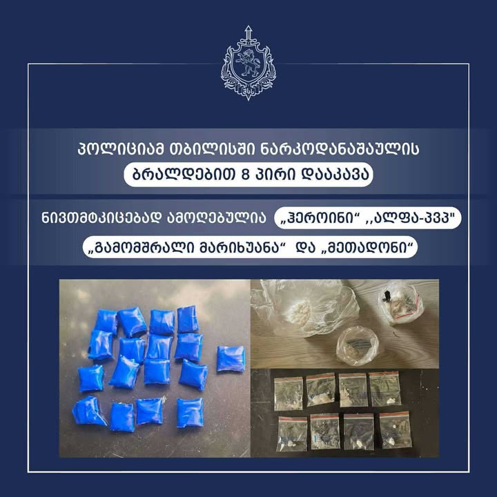 პოლიციამ თბილისში ნარკოდანაშაულის ბრალდებით 8 პირი დააკავა