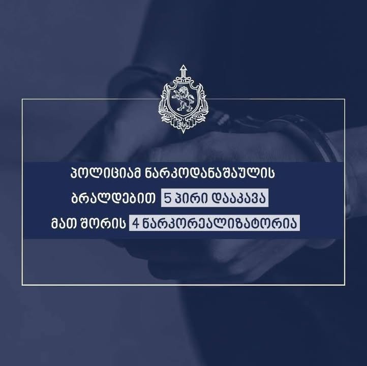 შინაგან საქმეთა სამინისტროს ცენტრალური კრიმინალური პოლიციის დეპარტამენტის ნარკოტიკების უკანონო ბრუნვის წინააღმდეგ ბრძოლის მთავარი სამმართველოს თანამშრომლებმა, ოპერატიული ღონისძიებებისა და საგამოძიებო მოქმედებების შედეგად, ნარკოდანაშაულის ბრალდებით 5 პირი დააკავეს, მათ შორის 4 ნარკორეალიზატორია.