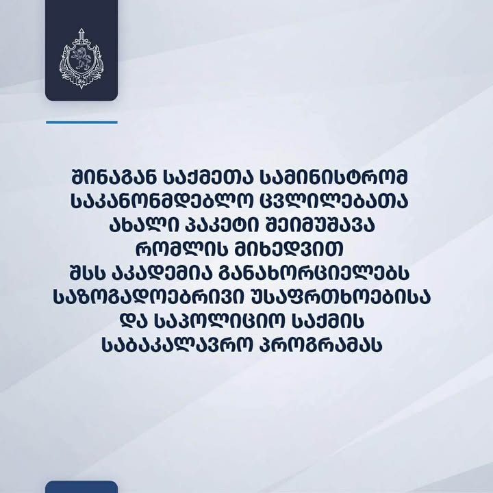 საქართველოს შინაგან საქმეთა სამინისტრომ საკანონმდებლო ცვლილებათა პაკეტი შეიმუშავა, რომლის მიხედვით შსს აკადემია განახორციელებს საზოგადოებრივი უსაფრთხოებისა და საპოლიციო საქმის საბაკალავრო პროგრამას