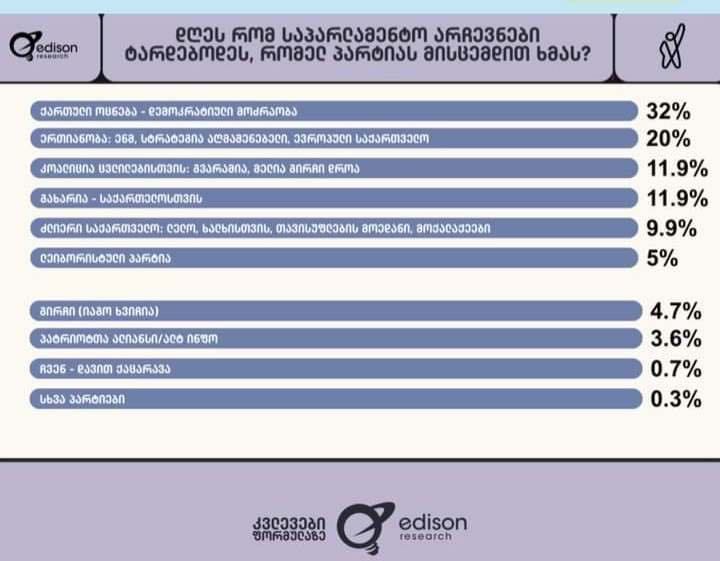 ტელეკომპანია ,,ფორმულა,, საზოგადოებრივი აზრის კვლევის მორიგ შედეგებს ასაჯაროვებს, რომელიც კეზერაშვილის ტელევიზიის დაკვეთით ,,Edison Research,,-მა ჩაატარა.