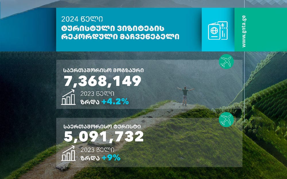 მათივე ცნობით, გასულ წელს საქართველოში 7 368 149 საერთაშორისო მოგზაურის ვიზიტი შედგა, რაც, 2023 წელთან შედარებით, ზრდა +4.2%-ია, 2019 წელთან შედარებით კი ვიზიტები 78.7%-ით აღდგა.