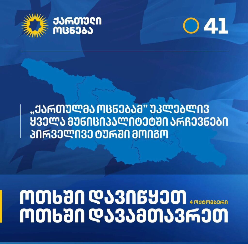 „„ქართულმა ოცნებამ“ უკლებლივ ყველა მუნიციპალიტეტში არჩევნები პირველივე ტურში მოიგო. ოთხში დავიწყეთ, ოთხში დავამთავრეთ“, – წერია ბანერზე, რომელიც პარტიის „ფეისბუქ“ გვერდზე გამოქვეყნდა.
