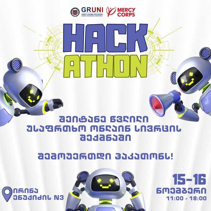15–16 ნოემბერს, გრიგოლ რობაქიძის უნივერსიტეტი Mercy Corps-ის მხარდაჭერით, გაძლევს შესაძლებლობას, მონაწილეობა მიიღო 48-საათიან ჰაკათონში და გუნდთან ერთად იმუშავო, როგორ შეიძლება შევქმნათ კიდევ უფრო უსაფრთხო, ეთიკური და გამჭვირვალე ციფრული გარემო.