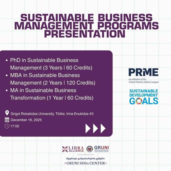 On 16 December 2025 at 17:00, Grigol Robakidze University will hold an event presenting the Master’s and Doctoral programs in Sustainable Business Management developed by the GRUNI SDGs Center