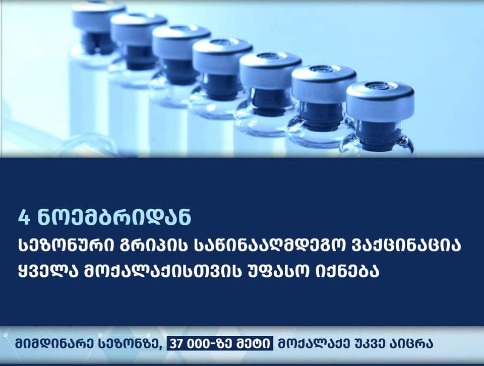 „ვაქცინა მორგებულია იმ შტამებზე, რომელთა ცირკულაცია მოსალოდნელია გრიპის სეზონზე. გრიპის ვირუსის საწინააღმდეგო ვაქცინაცია პროგრამის ფარგლებში პირველ ეტაპზე რისკჯგუფებს ჩაუტარდა. ამ დრომდე ქვეყნის მასშტაბით 37 000ზე მეტი მოქალაქე უკვე აიცრა. აცრა ვაქცინაციის სერვისის მიმწოდებელ სამედიცინო დაწესებულებებში ექვსი თვის ასაკიდანაა შესაძლებელი და სრულად უფასოა“, – აღნიშნულია ჯანდაცვის სამინისტროს ინფორმაციაში.