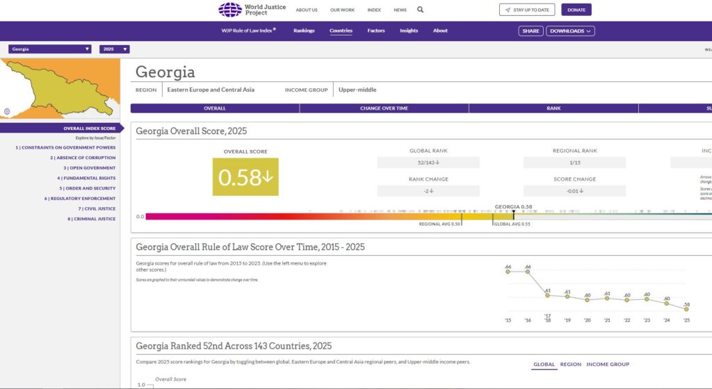 2025 წლის რეიტინგის მიხედვით, სისხლის სამართლის სისტემის, რეგულირების აღსრულების, ღია მთავრობისა და კორუფციის არსებობის ფაქტორებში საქართველო აღმოსავლეთ ევროპისა და ცენტრალური აზიის რეგიონის ქვეყნებს შორის პირველ ადგილზეა.